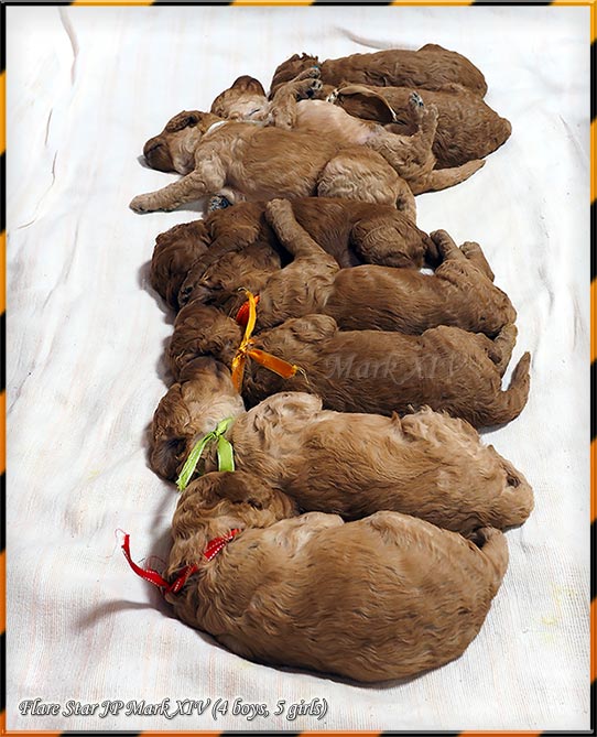 Flare Star JPでは、2020年4月8日に 「Mark XIV」の子犬が生まれました。牡4匹と牝5匹の元気なアプリコットとレッドの赤ちゃんです。写真はインスタグラムやラインに掲載しています。ホームページのリンク部からアクセスをご確認ください。 両親は、スタンダード・プードル犬種に薦められる遺伝性疾患検査を受けて結果はすべてクリアです。 ☆ 2020年6月14日をもちまして「Mark XIV」の新飼主募集を終了致しました。我が犬舎の子犬を希望する方は、気軽にお問合せ下さい!