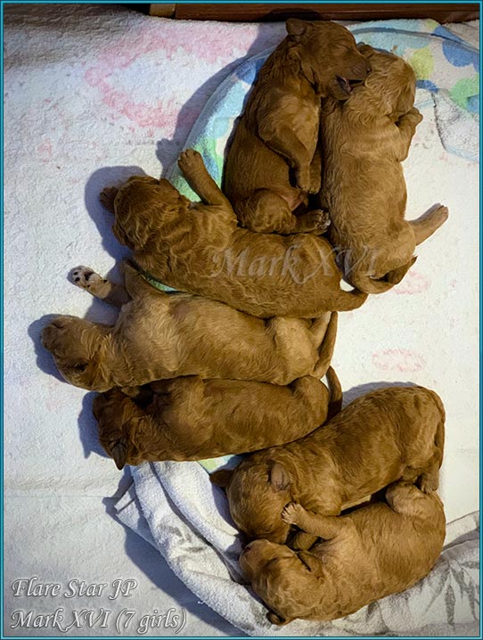 Flare Star JPでは、2021年3月3日に 「Mark XVI」の子犬が生まれました。不思議にメスのみの7匹のアプリコットとレッドのパピー達。写真は後程インスタグラムに掲載する予定です。ホームページのリンク部からアクセスをご確認ください。 両親やその先祖は、スタンダード・プードル犬種に薦められる遺伝性疾患検査を受けて結果はすべてクリアです。 ☆ 今回、以前からリクエストが多かった為、新飼主さんの募集を行いませんでした。我が犬舎の子犬を希望する方は、気軽にお問合せ下さい!