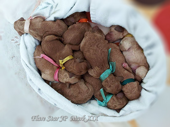 Flare Star JPでは、2022年4月26日に 「Mark XIX」の子犬が生まれました。牡4匹と牝6匹の元気なレッドとアプリコットの赤ちゃんです。写真はインスタグラムやブログに掲載しています。また右側にある子犬の名前をクリックしたらインスタグラムのページに移動します。 我が犬舎の子犬を希望する方は、気軽にお問合せ下さい!