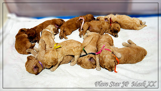 Flare Star JPでは、2022年7月1日に 「Mark XX」の子犬が生まれました。牡6匹と牝5匹の元気なアプリコットとクリームの赤ちゃんです。写真はインスタグラムやブログに掲載しています。また右側にある子犬の名前をクリックしたらインスタグラムのページに移動します。